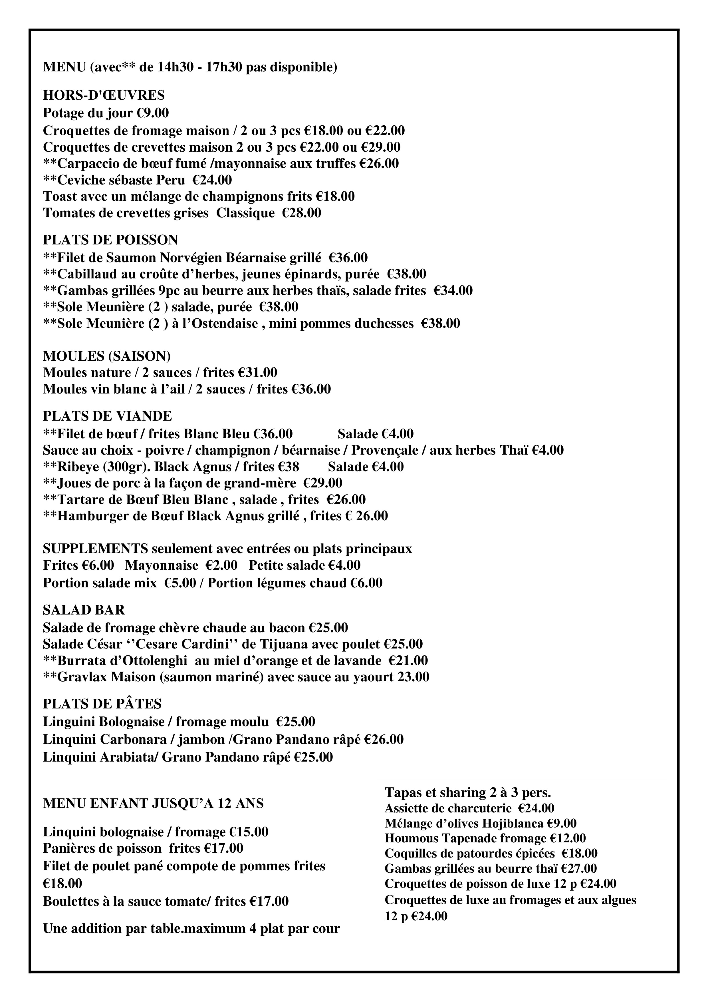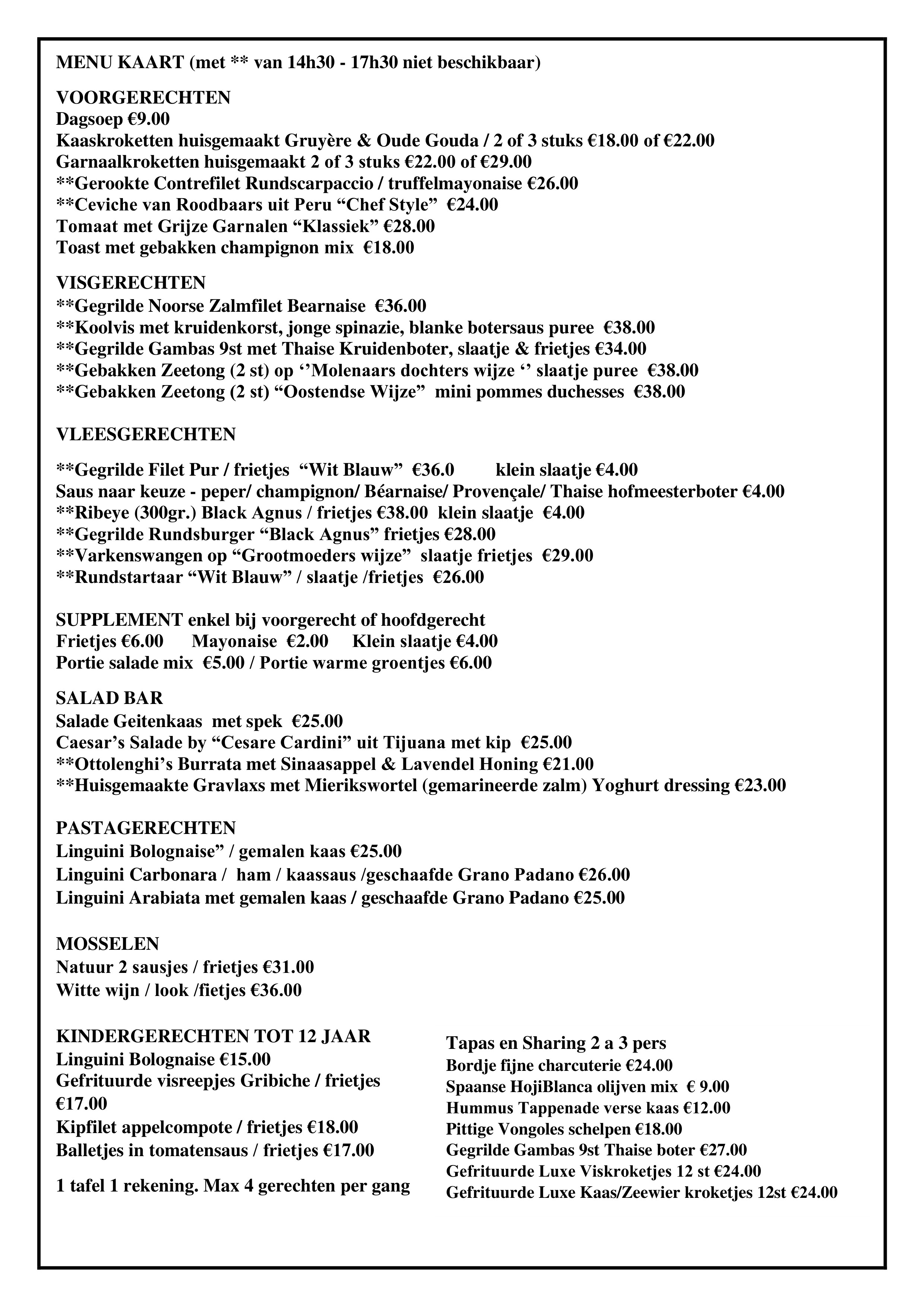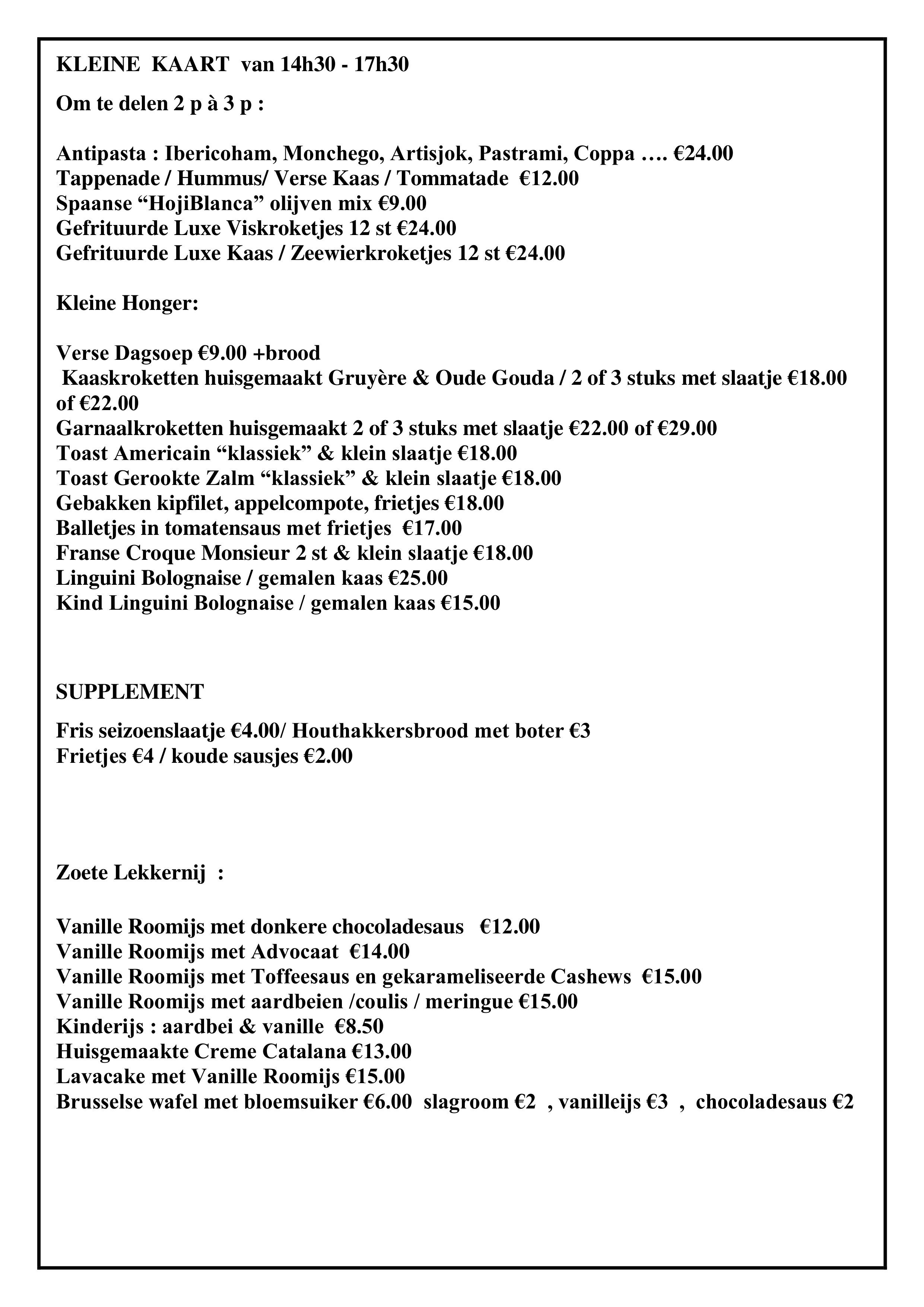 ’s Middags kan u met uw gezelschap genieten van een heerlijke lunch (soep of voorgerecht, hoofdgerecht vis of vleesgerecht) of à la carte alsook seizoensgebonden suggesties.